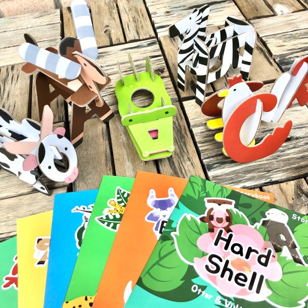 大家可以把這幾本書當作附加延伸就好。將書中的一些短句讓孩子當範例,將拼好的動物拼圖,跟著故事書,把故事用拼圖演出來,做點動態的延伸。畢竟,這不是一套專業撰寫的英文教材或故事書,不要幻想說附贈故事書唸一唸就能學會閱讀喔!但是,我覺得把字母拼成動物的巧思:真的非常棒!