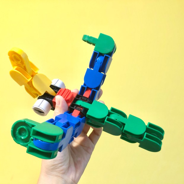 iRingo克服了這一點,我覺得就滿棒的。基本零件其實就那幾個,不需要為了組裝特別的造型而去尋找稀有的零件。積木可以從各個角度互相拼接:上/下、左/右、垂直/平行,拼好之後還能直接變換形狀,甚至180度旋轉。