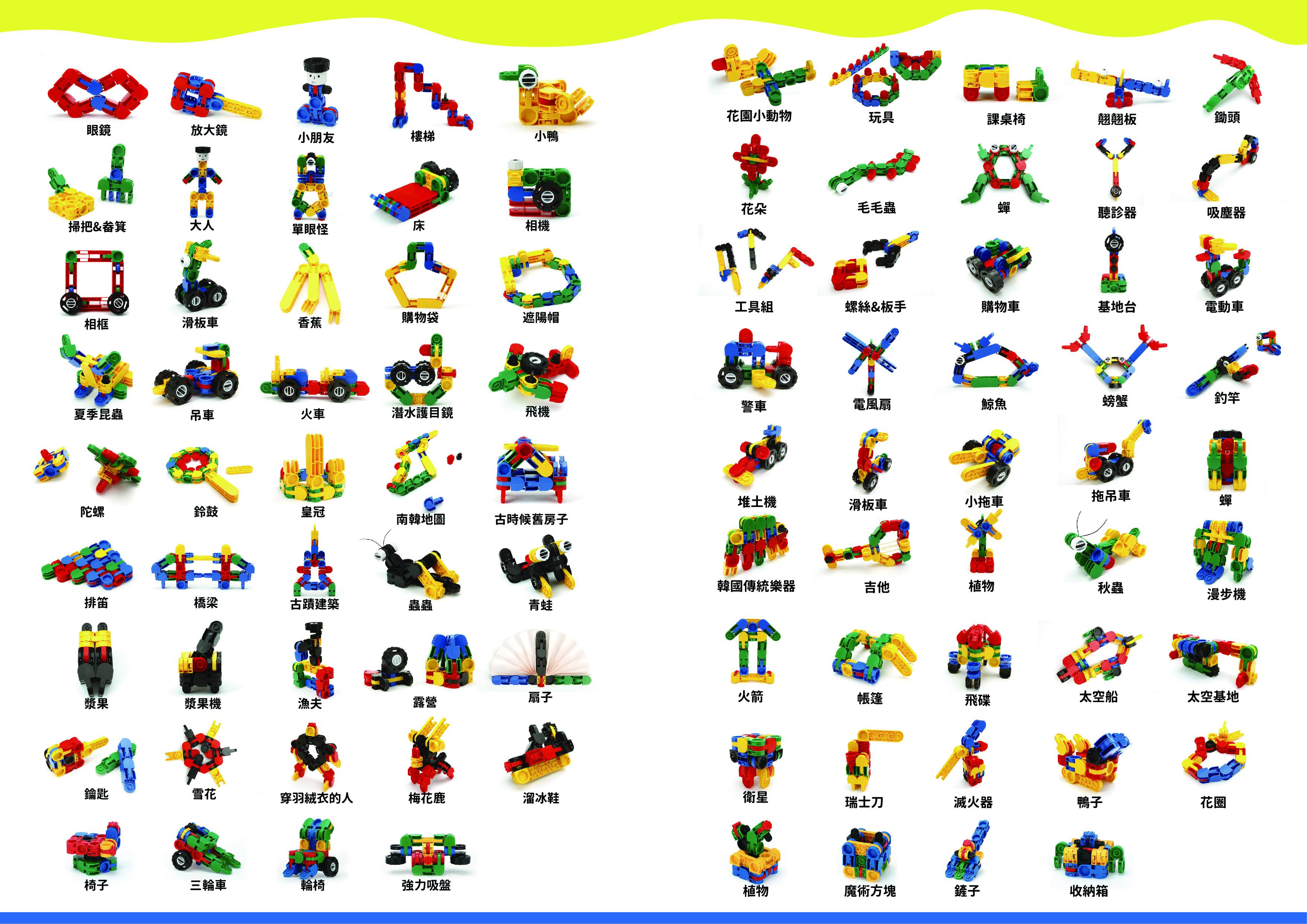 每一個小單盒都會附一張說明書,說明書上會介紹3~4種不同造型的組裝教學。積木片數越多,能組裝的造型就越豐富!