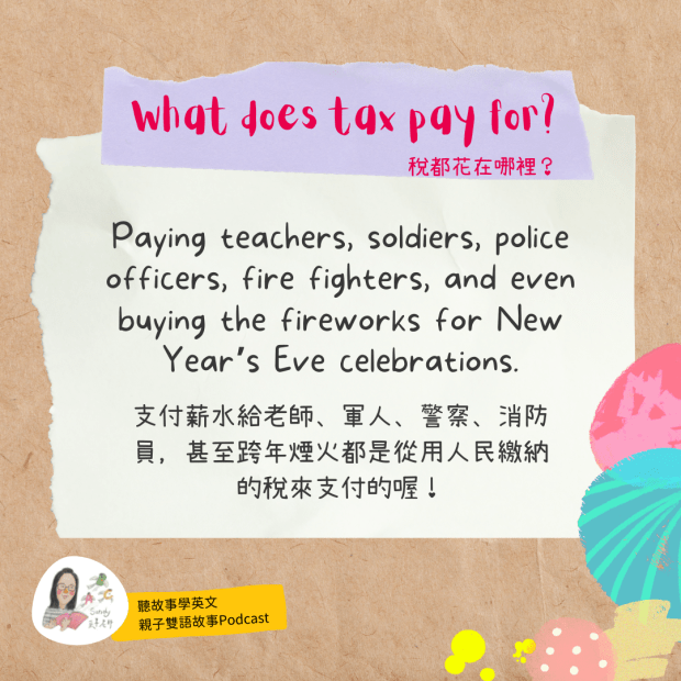 In Taiwan, people pay income tax in May every year. When you buy stuff, a part of your money also goes to tax.