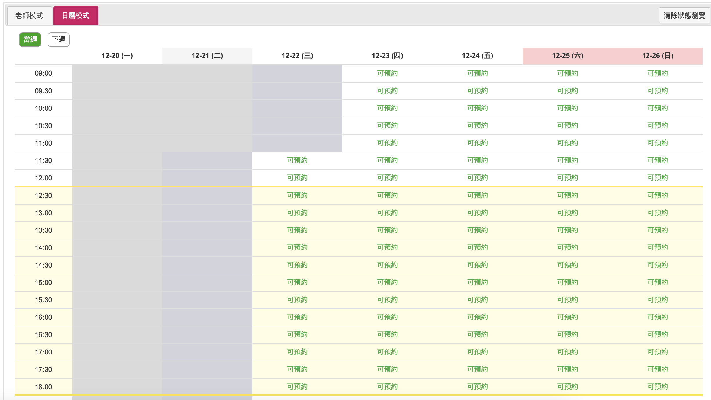 - 日曆模式:如果不介意每堂課的老師都是不同人,也可以直接先以孩子有空的時段為主,再去挑選那個時段有空檔的老師。其實,換老師也不會影響授課內容,因為教材是固定的,所以無論誰來教都是依循同樣一套教材。