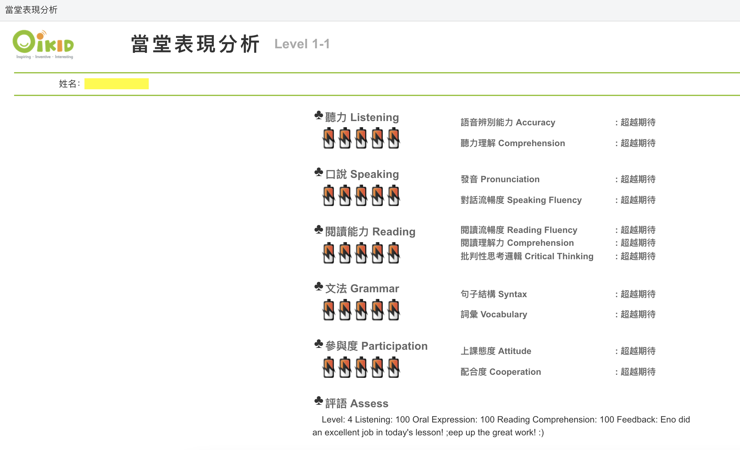 我是覺得低估太多了啦XD,按照我對自己小孩的了解,還有每個Level提供的課程綱要判斷,孩子起碼要在從Level 4以上開始才對。很有可能是第一次上體驗課時孩子還不適應,沒有正常發揮,所以表現得生疏。不過沒有關係,這個落點分析是一個參考。像我自己是英文教學專業,也非常清楚孩子的能與不能,所以可以準確幫孩子判斷。建議家長可以從旁觀察孩子的上課狀況,詢問孩子的感受,並跟班主任隨時做溝通、諮詢和調整。