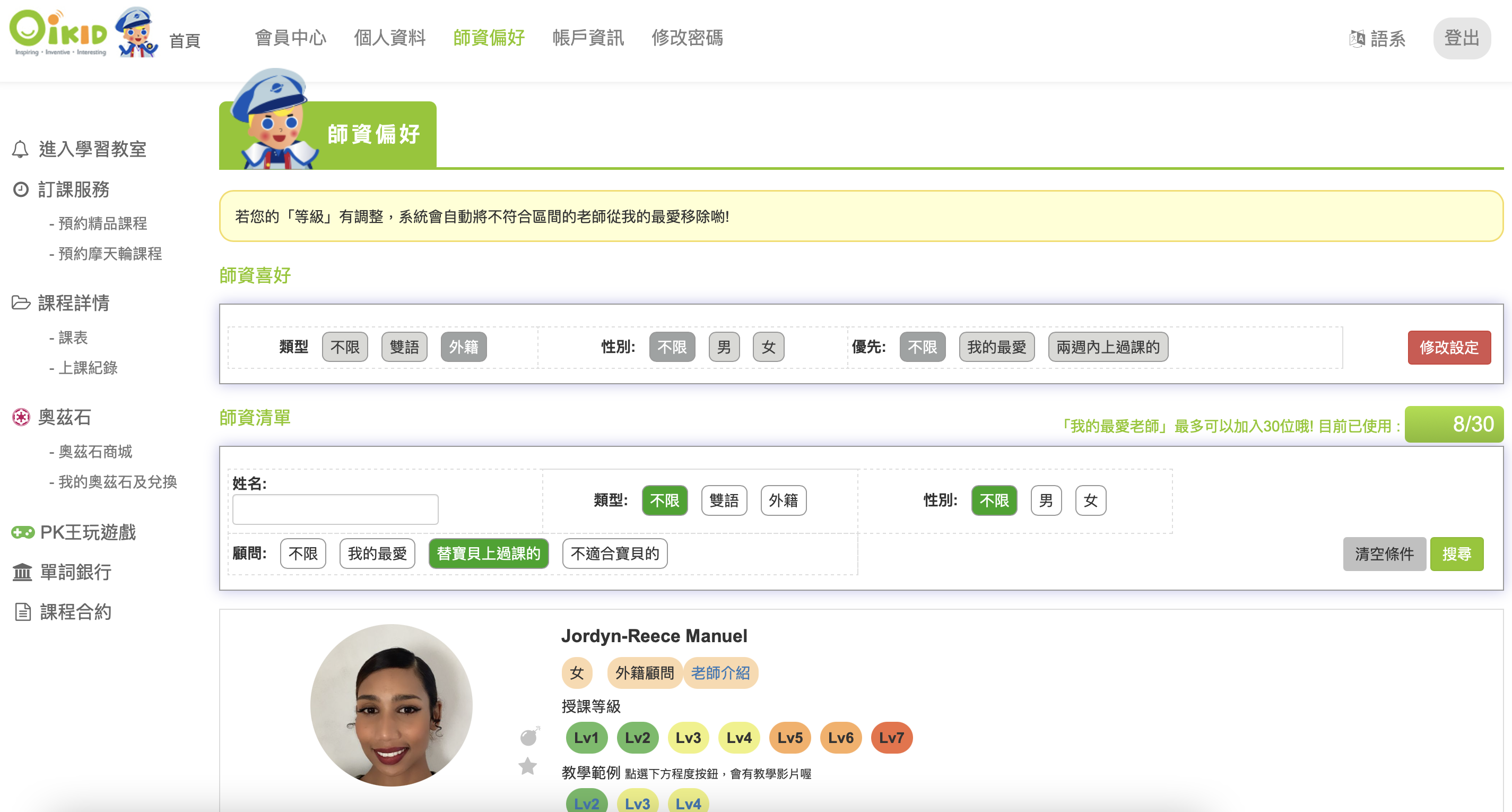 在挑選老師的頁面,除了有簡單的自我介紹文字,還可以看到每個老師的自我介紹影片&一段短短的教學範例影片。家長可以先聽聽看老師的聲音、視訊的影像品質、授課的節奏和教學,再選出有興趣的老師,加入「我的最愛」名單(最多30位老師)。