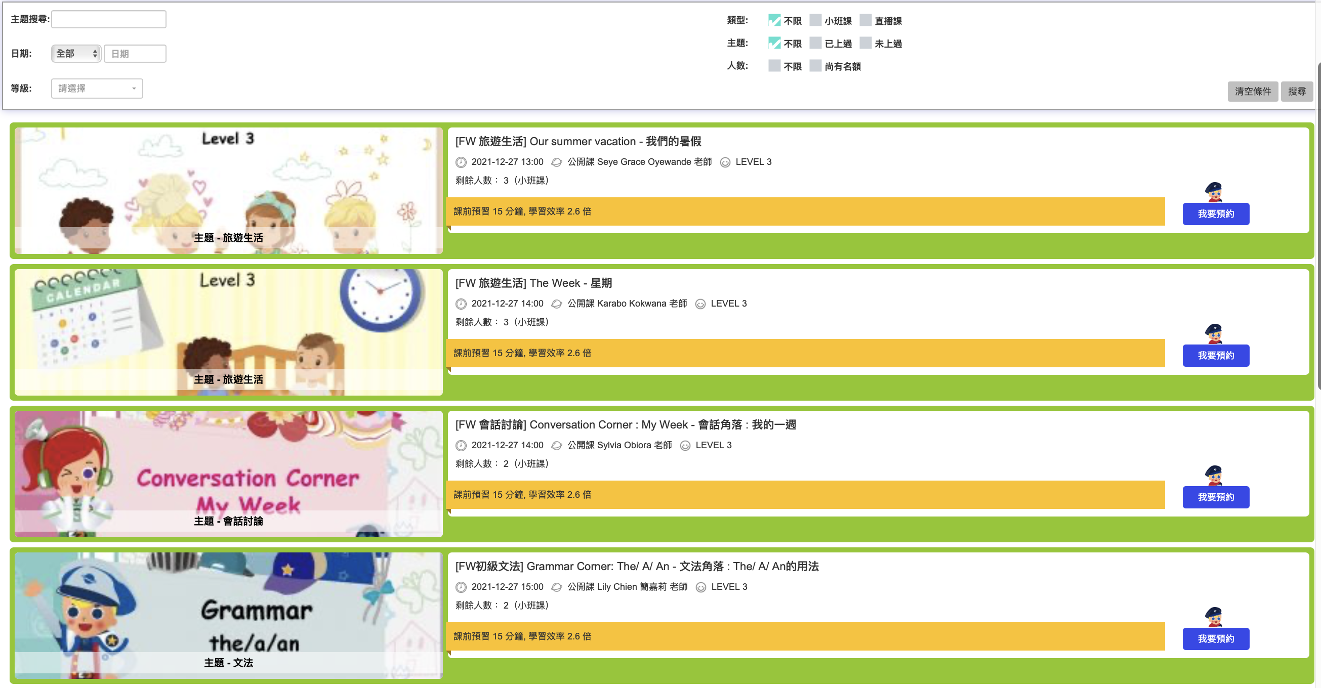 - 老師模式:依喜愛的老師為主,按照每個老師的空檔去約課。這個方式適合想要「維持固定師資」的孩子。