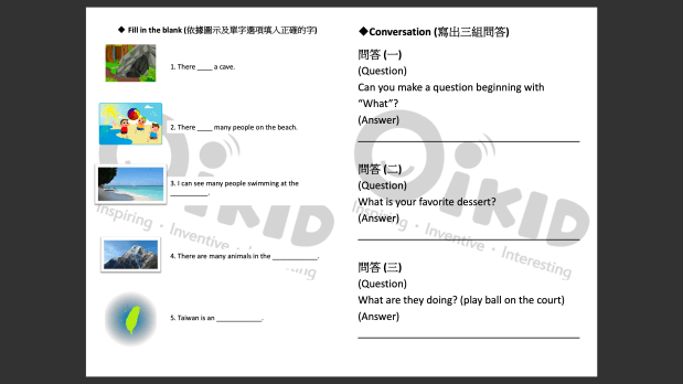 上課前有課堂預習影片,讓孩子先準備好上課的心情和內容。上完課後也能收看課程影片回放、下載列印教材PPT、下載列印複習的練習卷(學習單)、玩一個互動小遊戲當做課後作業。當然每堂課都能查看老師的評語、孩子上課的綜合表現評估表等,也能給老師建議(例如:請老師加快速度、或是想要多一點free talk的時間、請老師鼓勵孩子多用完整句子回答,不要只回答單字等等)。