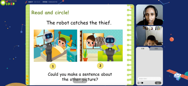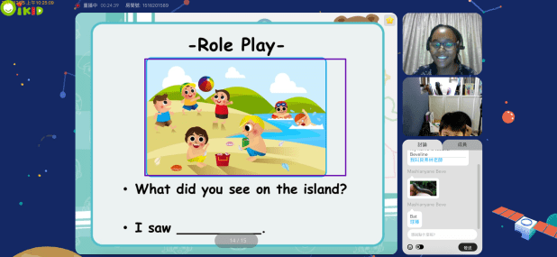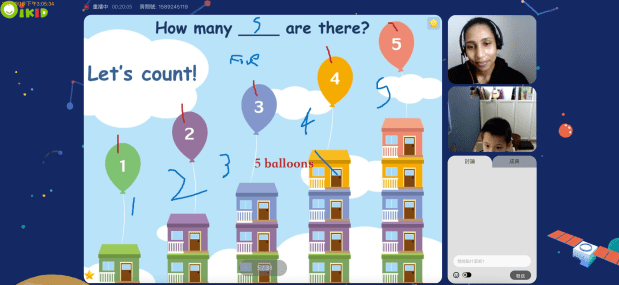 一開始兒子搞不太清楚狀況,一直以為一定要用滑鼠圈選或寫出答案,所以速度很慢。所以上課前,家長可以跟孩子事先溝通,讓小朋友知道有什麼問題就直接對著畫面跟老師說話就好,也鼓勵小朋友盡量用「完整的句子」回答,不要只回答一個單字。