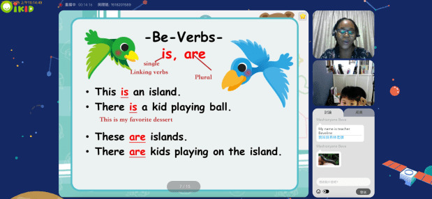 從螢幕上,家長可以清楚看到還剩多少時間?教到第幾章投影片?畫面是互動白板的形式,老師會在畫面上打字、畫記號、也會透過文字訊息欄跟孩子溝通。