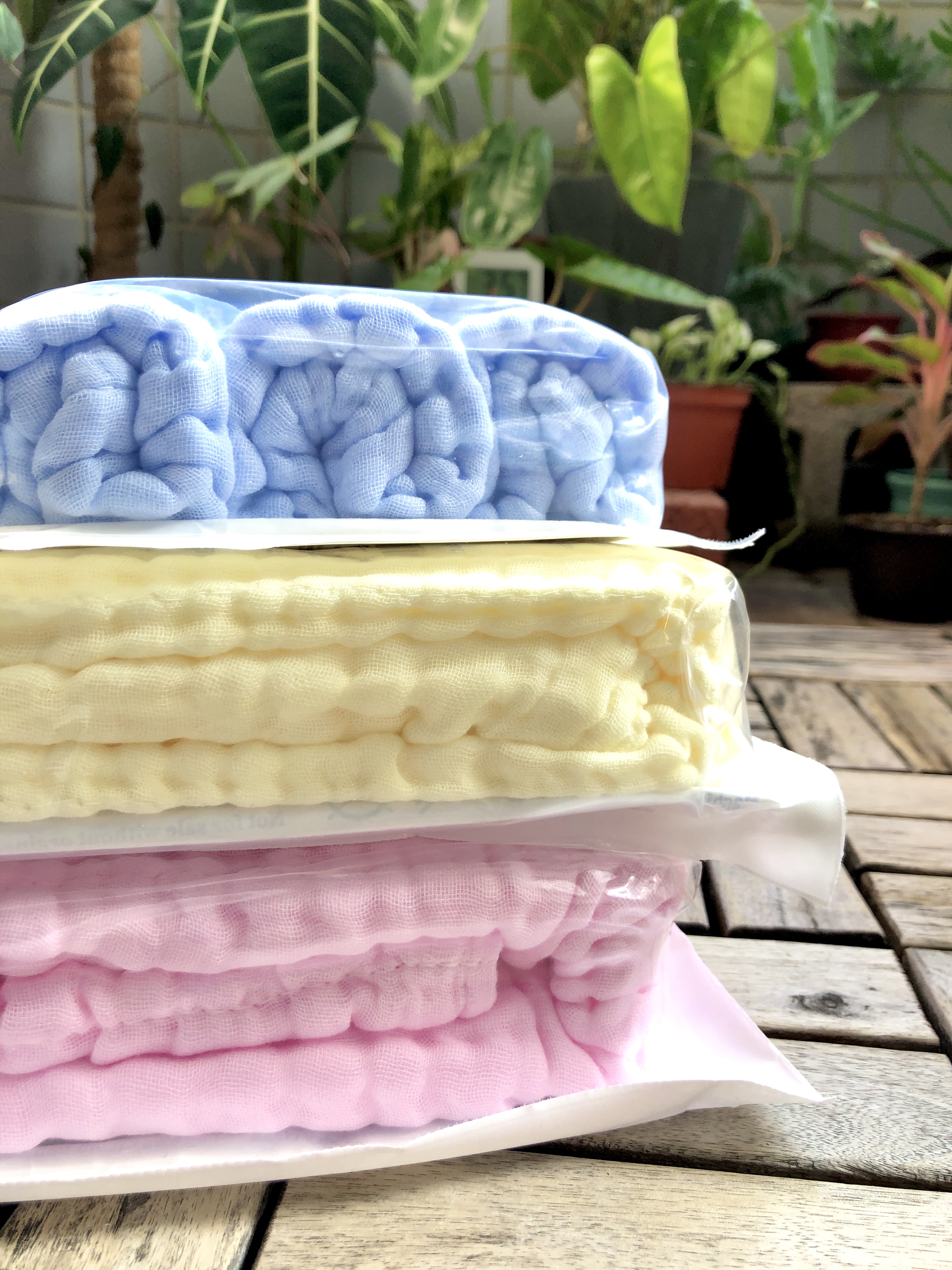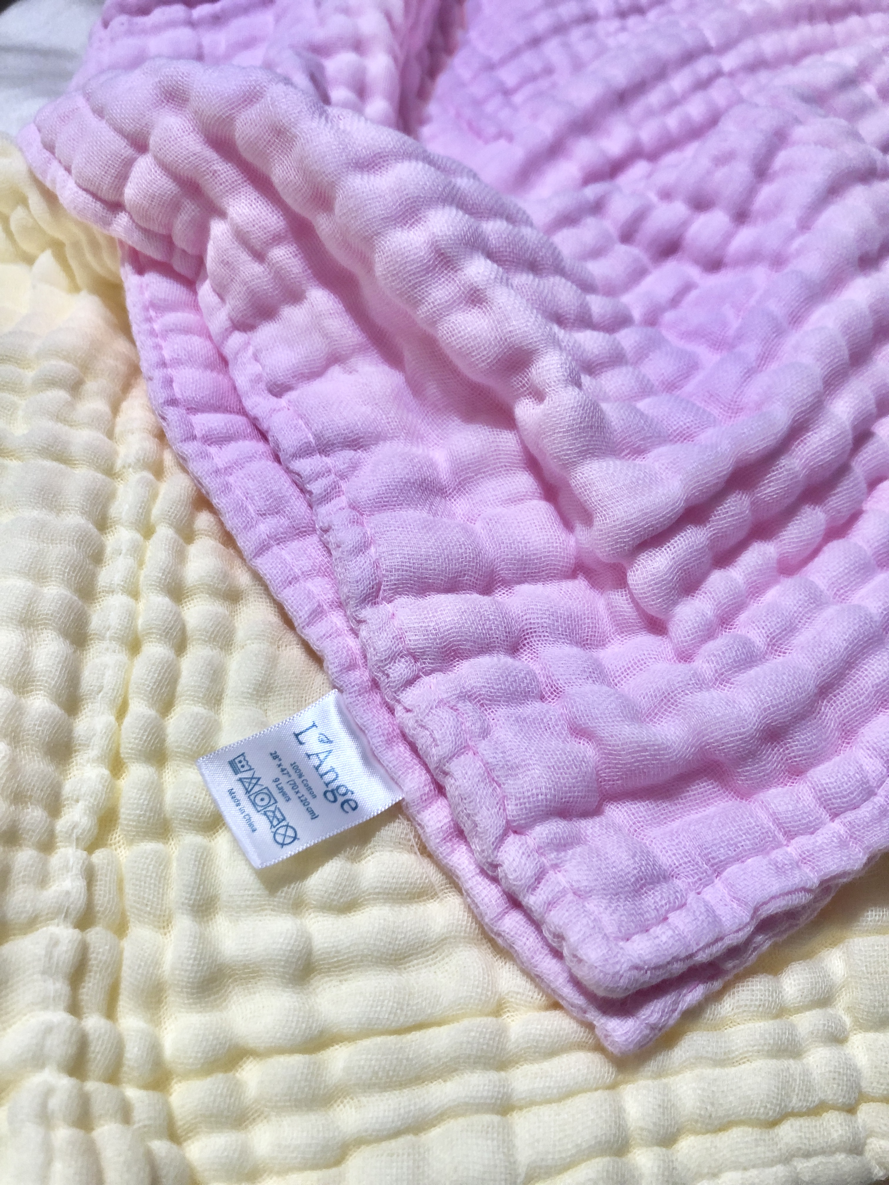 L’Ange棉之境有各式各樣的尺寸,有分「三層紗」、「六層紗」或是再厚一點的「九層紗」,所以用途非常多元。我會建議小孩用六層紗剛好,大人可以選擇九層紗。寶寶還小的時候可以用三層紗包巾,或是用六、九層紗當床包、安撫巾、拍嗝巾。小孩長大一點就變坐在汽座上的蓋毯、擦臉的毛巾、浴巾、甚至是大人拿來擦頭髮,都非常棒!