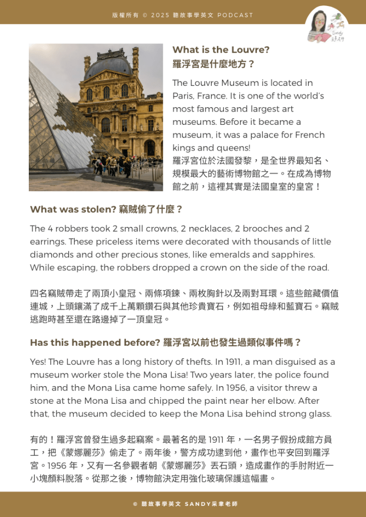 羅浮宮位於法國發黎,是全世界最知名、規模最大的藝術博物館之一。在成為博物館之前,這裡其實是法國皇室的皇宮! - What was stolen? 竊賊偷了什麼?